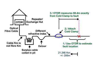 Our unique Cold Clamp locates fiber optic cable breaks & faults to a physical accuracy of better than 1 meter over long distance.